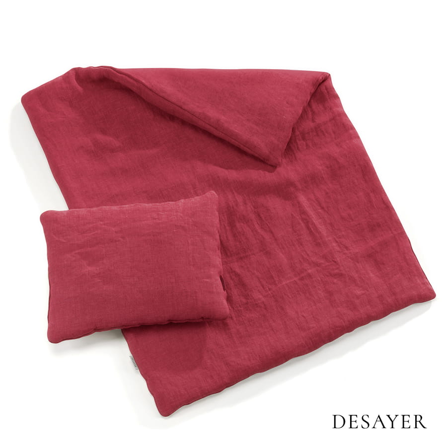 Red linen bedding for babies with filling. The bedding is made of 100% soft linen fabric, which is very delicate for the baby's skin. Pillow and quilt are filled with light and fluffy silicone nonwoven fabric, which makes it possible to use it all year round. The dimensions of the pillow are 25x35 cm, and the quilt are 60x75 cm, height is about 3 cm. The size of the bedding is perfect for the DESAYER wicker babycot, the Moses basket or a pram.