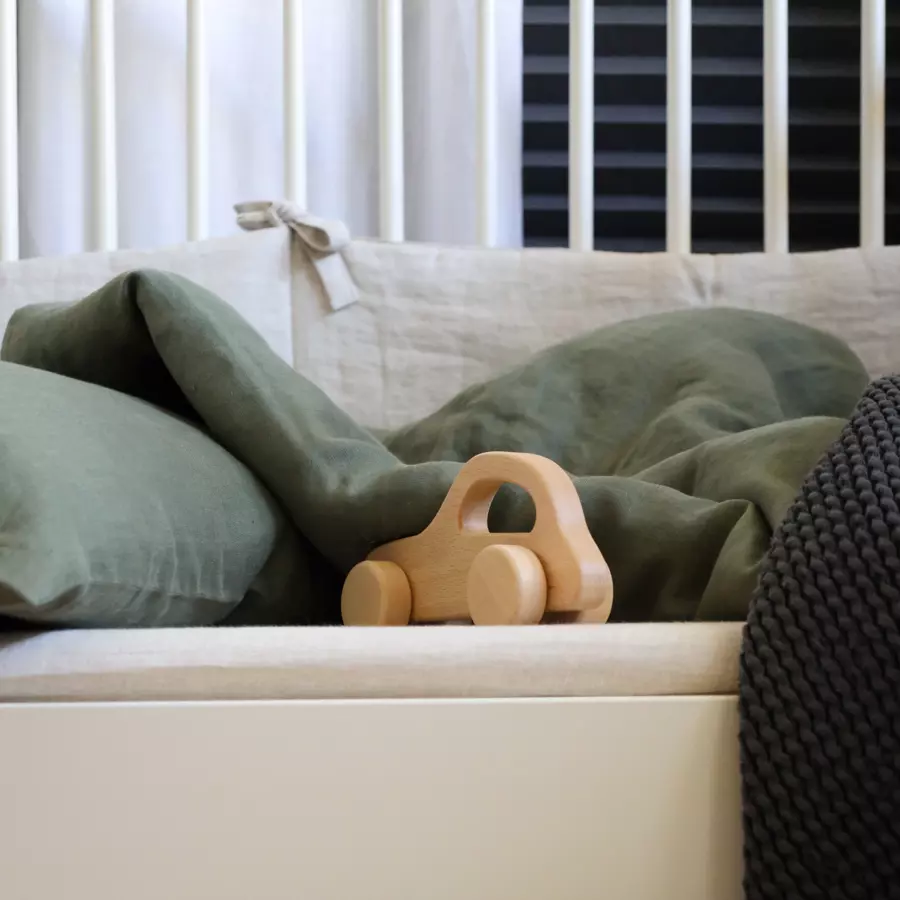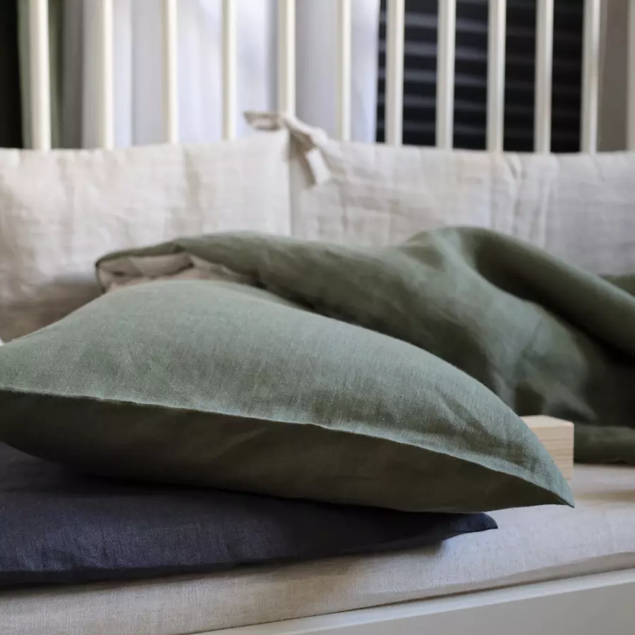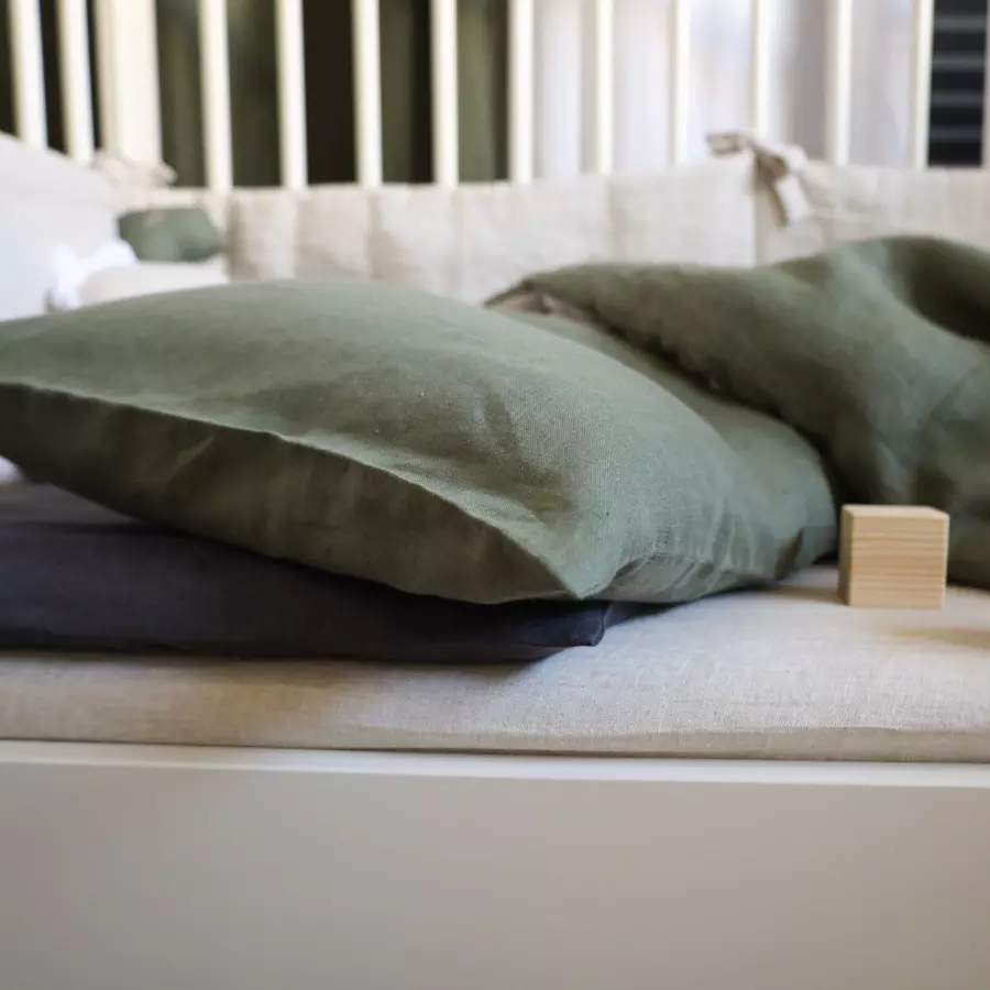 Classic green linen bedding for kids. It is made of 100% softened linen fabric, which is very delicate for the child's skin. Both the pillow and the quilt are closed with an overlap. Write to us if you prefer a safe zipper. The bedding can also be sewn with a fluffy silicone filling. The bedding is light and can be used all year round. The natural properties of linen will give your baby a deep, healthy sleep, which will positively affect its natural development.