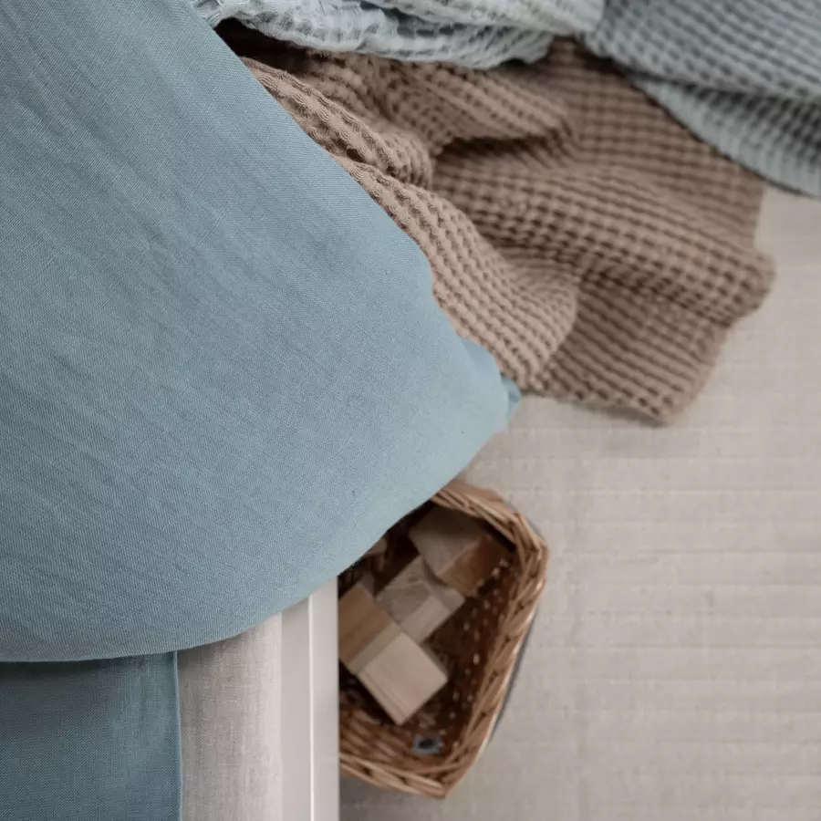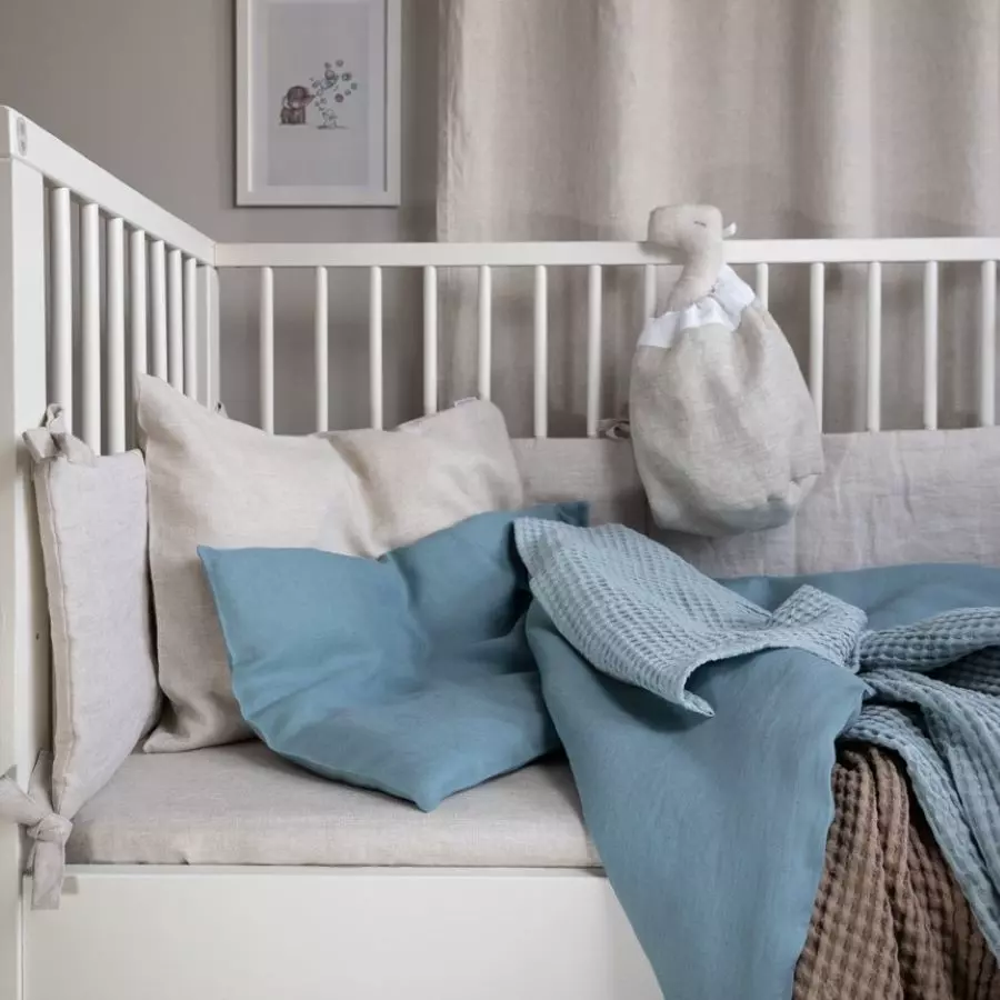 Classic turquoise linen bedding for kids. It is made of 100% softened linen fabric, which is very delicate for the child's skin. Both the pillow and the quilt are closed with an overlap. Write to us if you prefer a safe zipper. The bedding can also be sewn with a fluffy silicone filling. The bedding is light and can be used all year round. The natural properties of linen will give your baby a deep, healthy sleep, which will positively affect its natural development.