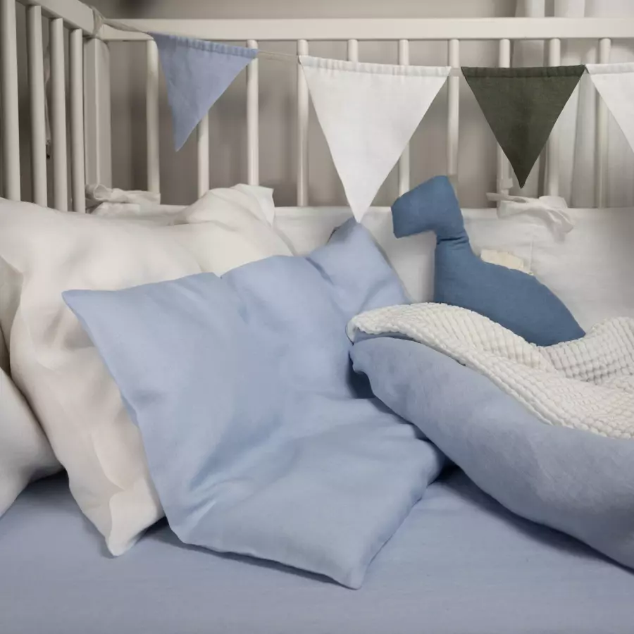 Classic sky blue linen bedding for kids. It is made of 100% softened linen fabric, which is very delicate for the child's skin. Both the pillow and the quilt are closed with an overlap. Write to us if you prefer a safe zipper. The bedding can also be sewn with a fluffy silicone filling. The bedding is light and can be used all year round. The natural properties of linen will give your baby a deep, healthy sleep, which will positively affect its natural development.