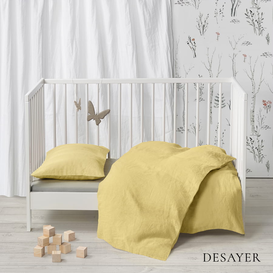 Classic yellow linen bedding for kids. It is made of 100% softened linen fabric, which is very delicate for the child's skin. Both the pillow and the quilt are closed with an overlap. Write to us if you prefer a safe zipper. The bedding can also be sewn with a fluffy silicone filling. The bedding is light and can be used all year round. The natural properties of linen will give your baby a deep, healthy sleep, which will positively affect its natural development.