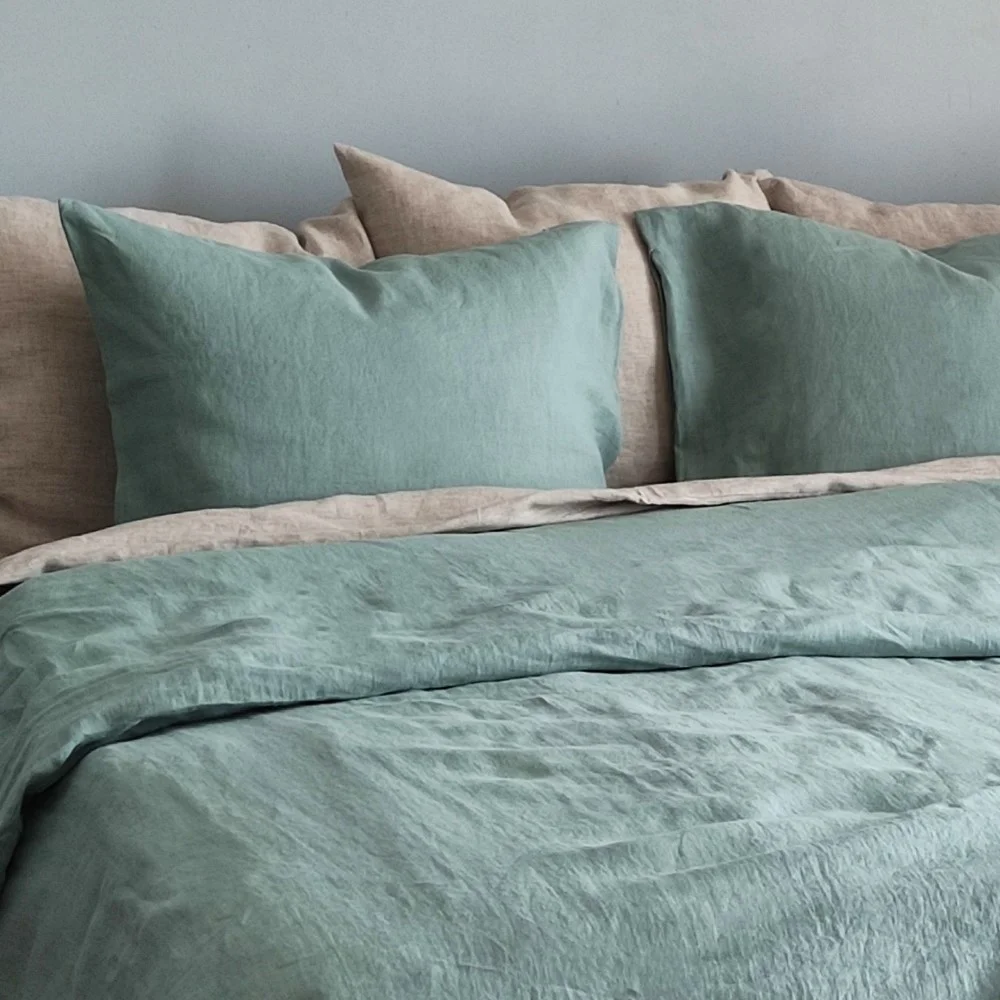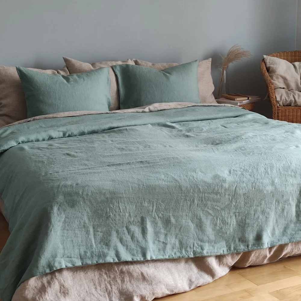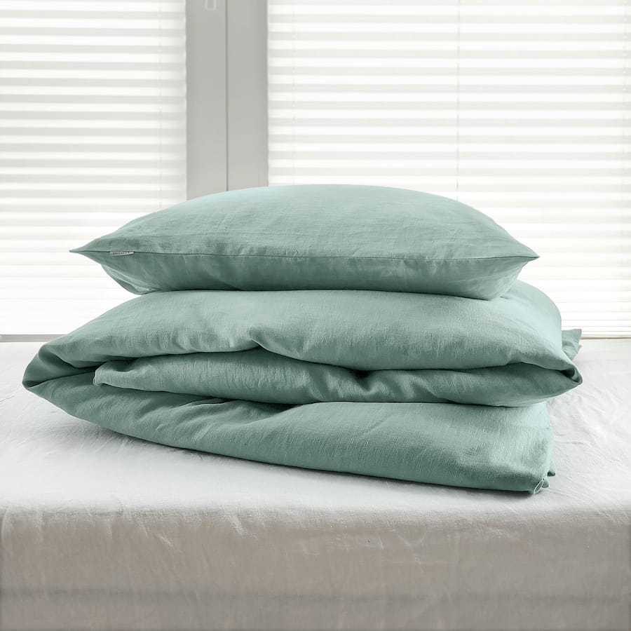 Linen bedding set in sage green colour with an envelope opening. This light green shade brings relaxation mood into the bedroom. The bed linen is made of soft 100% natural linen fabric.