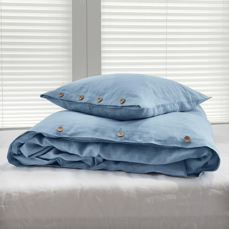 Linen bedding set in blue colour with wooden buttons. This shade of blue is associated with summer relaxation and peace. Choose this color if you want to fill your bedroom with a positive summer aura. The bed linen is made of soft 100% natural linen fabric.