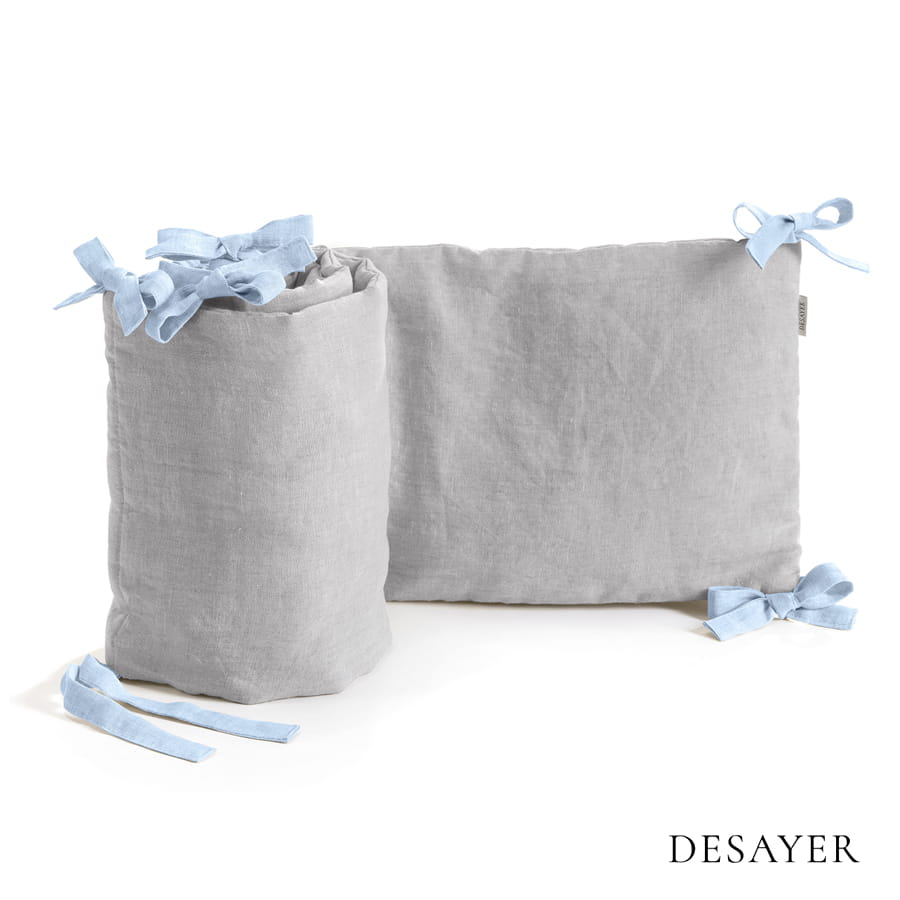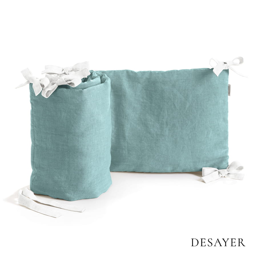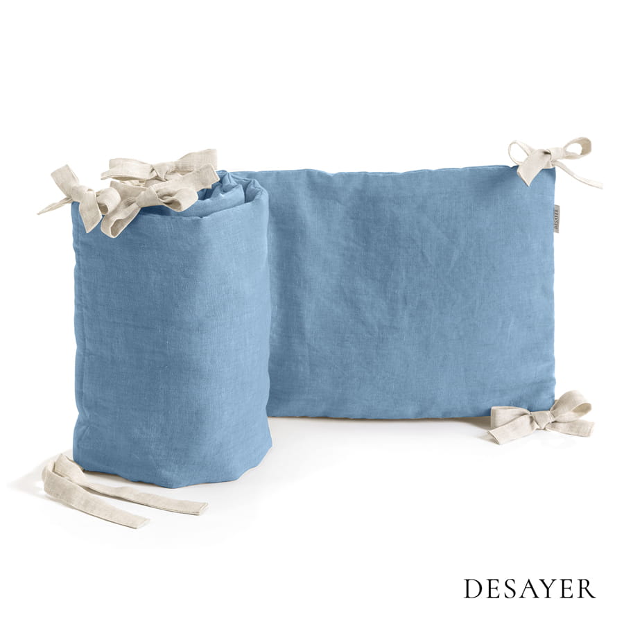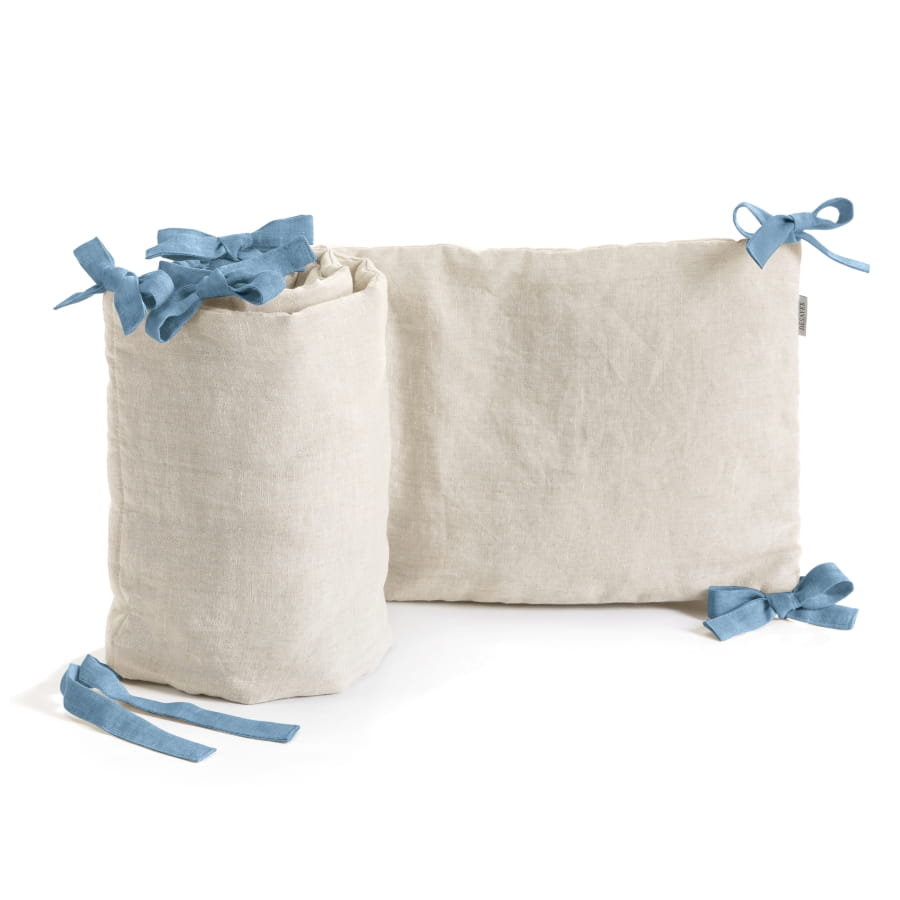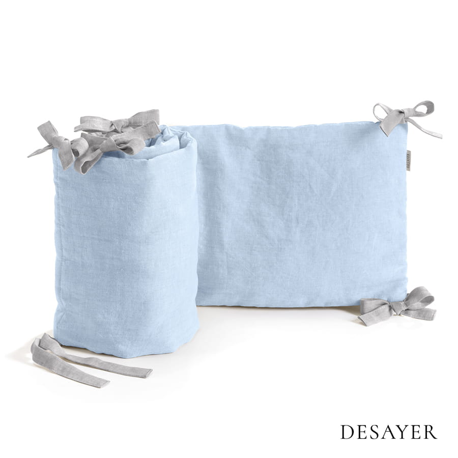 Sky blue linen bumper for a baby cot. It is filled with light and fluffy silicone fibres, which provides soft protection for the baby. The bumper is made of 100% softened linen fabric, which is very breathable and delicate for the child's skin. The natural properties of linen ensure your child's safety and healthy sleep, which positively affects its natural development.