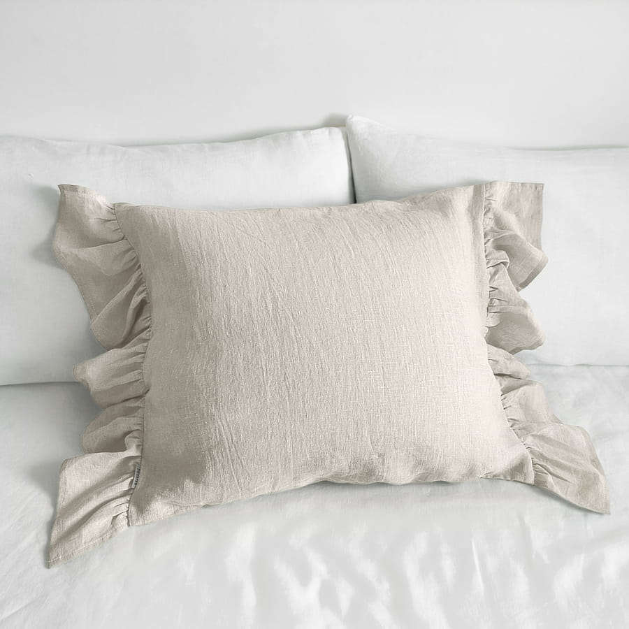 Linen pillowcase with frills. The colour will bring large dose of natural relax to your bedroom. Frills, like butterfly's wings, decorate the pillowcase on both sides, adding delicacy and airiness. The pillowcase is made of a soft 100% natural linen fabric, closed with an overlap, and the size is measured without flounces.