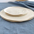 Jest to ręcznie wykonane naczynie, przez co jest absolutnie niepowtarzalnym produktem. Nie ma możliwości na zrobienie dwóch identycznych talerzy. Różnice będą zawsze widoczne szczególnie w zestawieniu dwóch, trzech podobnych naczyń np. mogą różnić się wielkością, kształtem, wysokością rantu. Na powierzchni talerza widać ślady pracy rąk, ścianki są nierównej grubości a krzywizny pokazują w jaki sposób został zrobiony przedmiot. Powierzchnia talerza pokryta jest błyszczącym szkliwem, w dotyku wręcz aksamitnym. To daje jej niepowtarzalny elegancki wygląd.