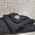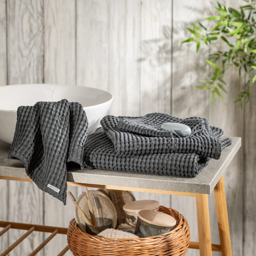 Graphite waffle towel is a towel with an exceptionally decorative waffle texture. The towel is made of linen-cotton fabric. The linen content is responsible for the high absorbency and quick drying of the towel. Cotton, on the other hand, creates a unique towel texture called a waffle. The linen-cotton towel is soft and light, making it an ideal friend not only at home SPA, but also for long and short journeys, visiting the swimming pool, gym or beach.