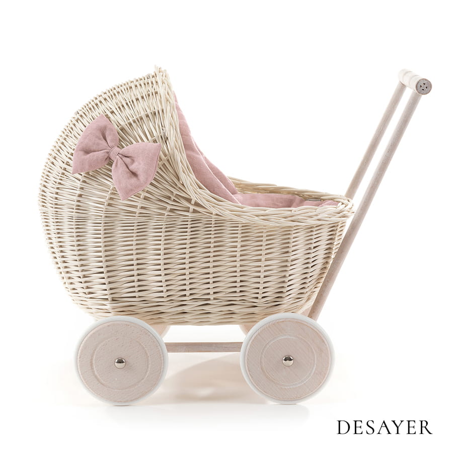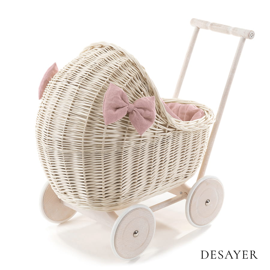 A wicker doll pram made of white wicker trimmed with dim pink linen and a pillow and quilt in the same color. Such a pram is a naturally beautiful gift for every "little mom". It offers joyful and safe fun both at home and on a walk on warm, dry days. The doll pram is hand-woven, therefore each piece is unique. The center of the pram has been carefully trimmed with a soft linen fabric. The set also includes a lovely linen pillow and quilt decorated with frills and bows. The DESAYER offer includes several color variants of linen and wicker, so you can choose the perfect set for your girl.