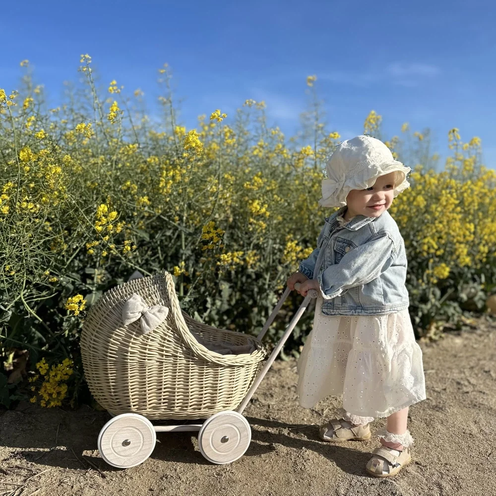 It was made of 100% natural materials that are both human and planet friendly. The top of the pram is hand-woven from European wicker, and the bottom and chassis are made of beech wood. The structure is stable and safe. The wooden wheels are rubberized, which makes it move very quietly and softly.